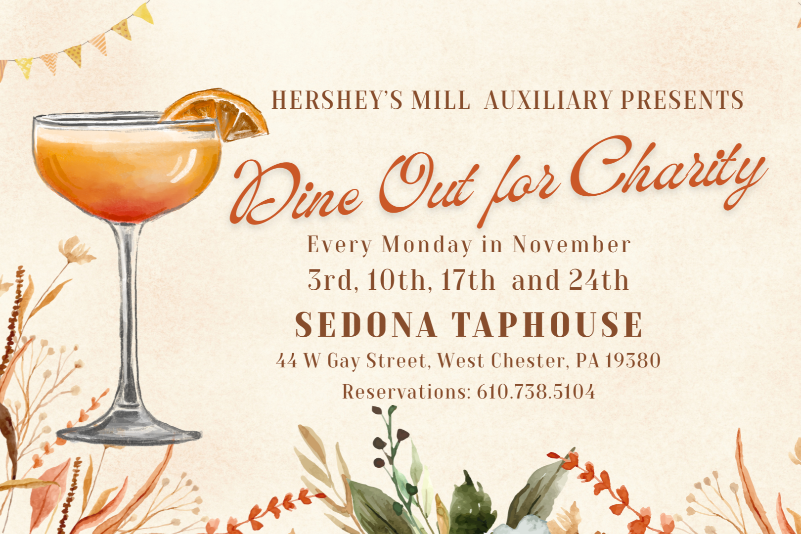 Dine Out for Charity at Sedona Taphouse with the Hershey’s Mill Auxiliary! Join us every Monday in November: November 3, November 10, November 17 and November 24th come for lunch, come for dinner! Sedona Taphouse will donate $1 to our Pledge to Chester County Hospital for each order from their special “Dine Out for Charity” menu selections! Take a day off from cooking and join us for a great cause!